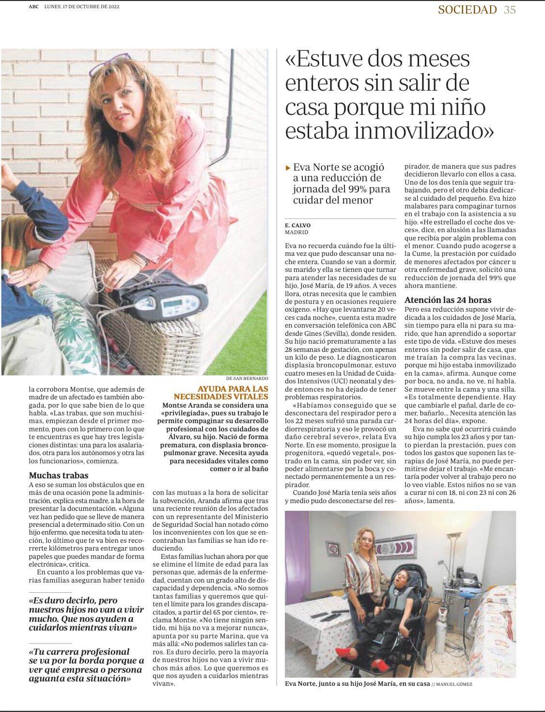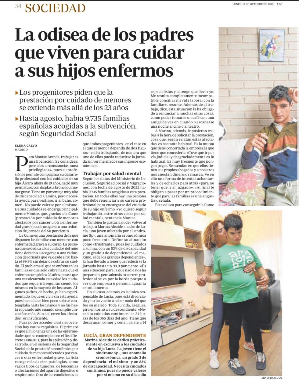 La pasada semana el periódico ABC entrevistó a Marina Alcaide, mamá de Lucía, ambas socias de nuestra Fundación 5p. Marina reclama que la prestación para el cuidado de su hija con discapacidad se extienda a más de 23 años. Que en su caso es la única responsable de Lucía, pues está divorciada y no ha vuelto a saber nada del que fue su marido.