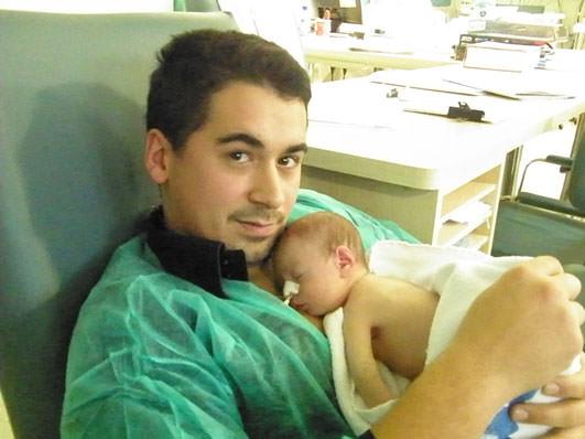 Esta historia comienza con la lucha por la vida, ya que Sara en el momento del parto sufrió muchísimo en las contracciones, pues cada vez que yo sufría una contracción su diminuto corazón prácticamente dejaba de latir. Así que su nacimiento fue por cesárea por el riesgo que corría la vida de Sara, siendo su primer llanto como el maullido de un gatito. De la sala de partos fue directa a la Incubadora ya que nació con 1,900kg y 45cm y no autorregulaba su temperatura. Con una evidente microcefalia (cabeza pequeña), pies varos (pies torcidos hacia dentro) y debiéndose de alimentar por sonda nasogástrica (tubo de PVC desde la nariz al estómago) pasó una semana ingresada, semana en la cual pudo sentirse abrazada y querida gracias al método Madre/Padre Canguro.