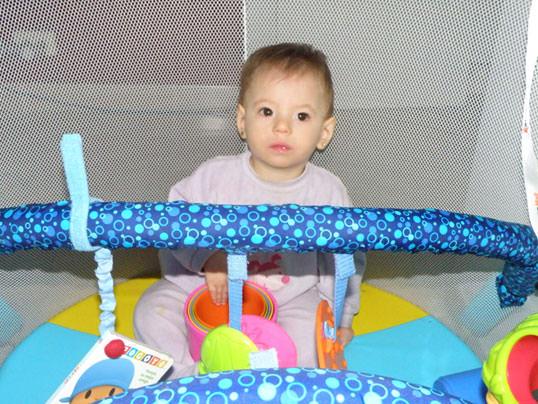 Su crecimiento fue lento ya que no comía bien y debíamos llevar un control semanal con su enfermera del peso, que muy lentamente iba ganando. Solo comía si mientras le daba el biberón (al pecho fue imposible que se enganchara) la agitabas suavemente. No lo sabíamos (inicialmente no sabíamos que tenía hipotonía) pero no podía tragar y con el traquetreo le hacíamos bajar la leche. Por su defecto en los pies, inició al mes de vida sesiones de fisioterapia, las cuales hoy día todavía necesita, ya que aunque no todo el tiempo, ha de llevar unas férulas correctoras (dafos) en los pies. Desde bien pequeña es una niña feliz ya que desde que tenía pocos días de vida, en su cara siempre hay una sonrisa. Una sonrisa dulce que derrite a cualquiera. A los 7 meses fue diagnosticada con el Síndrome 5p- (o maullido del gato) porque se le hizo un cariotipo (estudio genético) ya que a los 6 meses por la hipotonía (bajo tono muscular), no era capaz de mantener la cabeza. Pero su hipotonía nunca la ha frenado para avanzar! Ya que es una niña curiosa y con mucha energía, y unas ganas enormes de aprender. Con 12 meses se mantenía sentada con apoyo, apenas articulaba palabra y se despertaba de madrugada con ganas de juego y marcha, con 18 meses con gestos que imitan a los animales podía hacerte el animal que le pidieras (gestos que veía en los bailes de Cantajuegos).